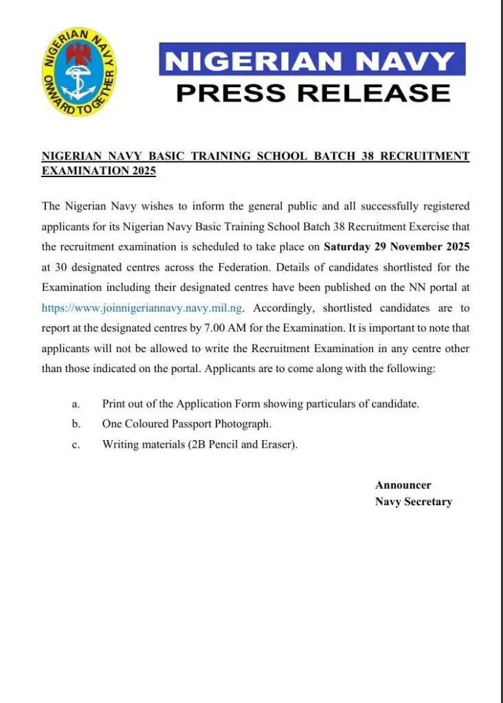 The Nigerian Navy has officially announced the examination schedule for the Nigerian Navy Basic Training School (NNBTS) Batch 38 Recruitment Exercise for 2025. This update is crucial for all applicants who successfully completed their registration and are now preparing for the upcoming screening.